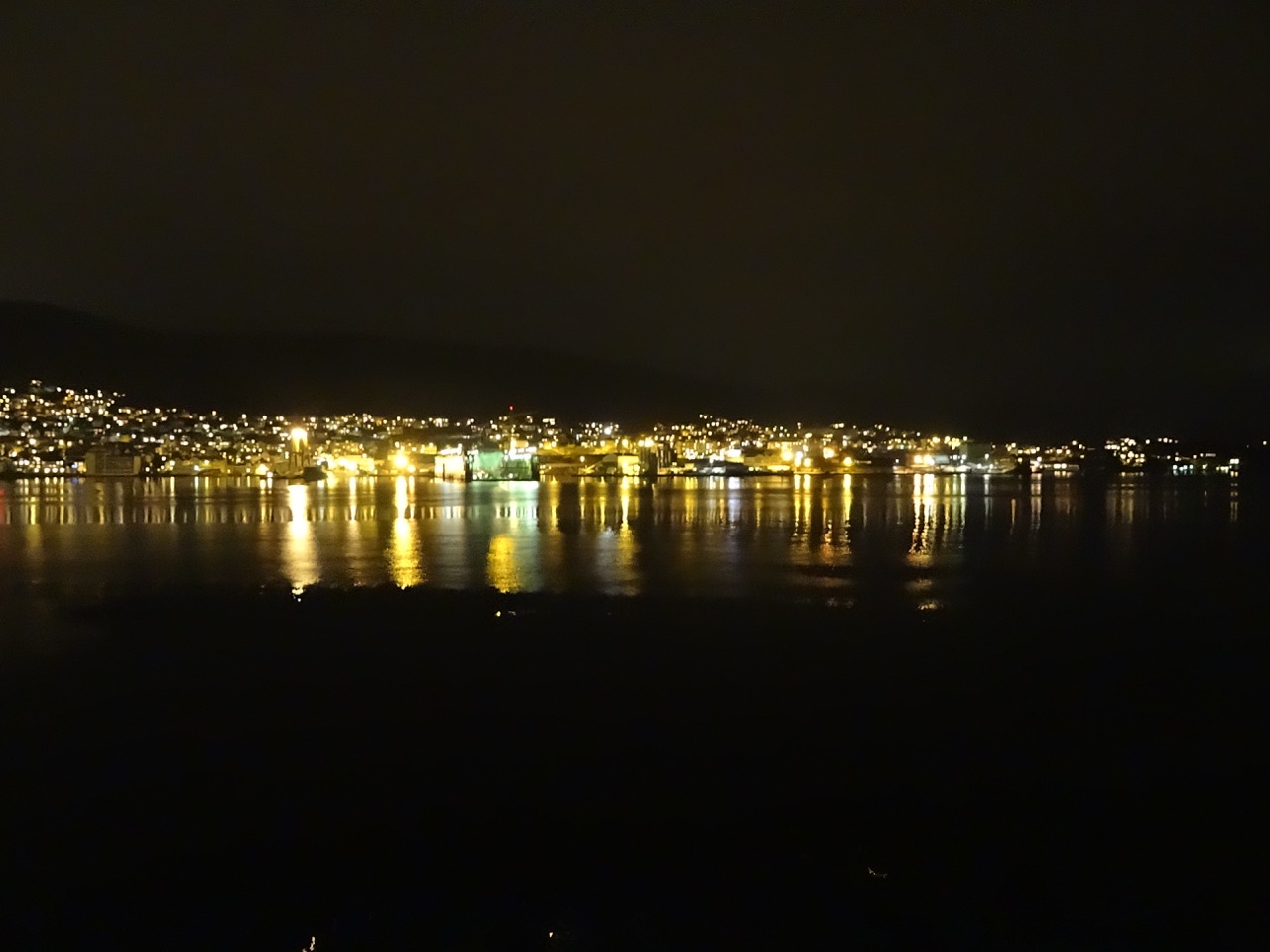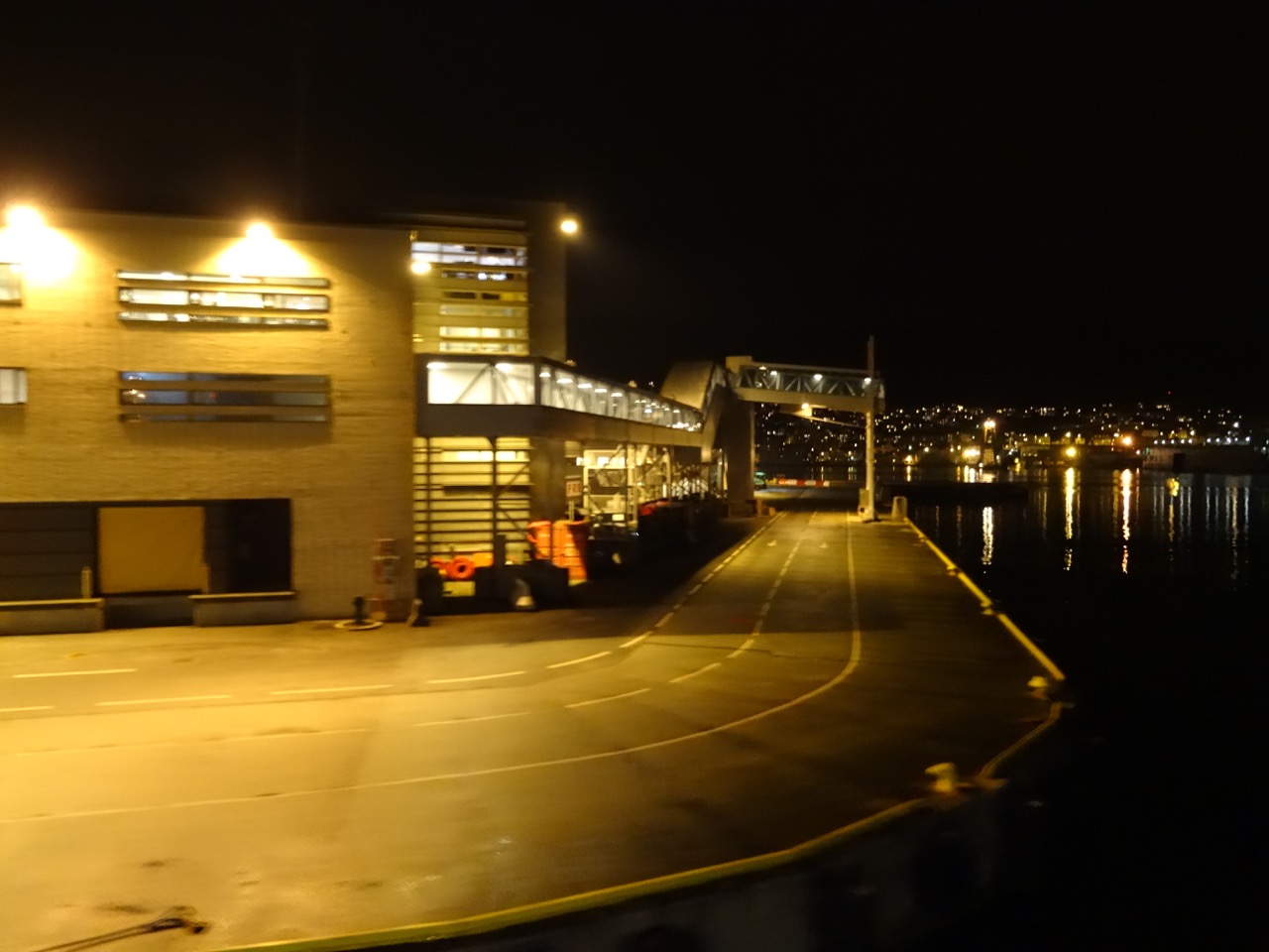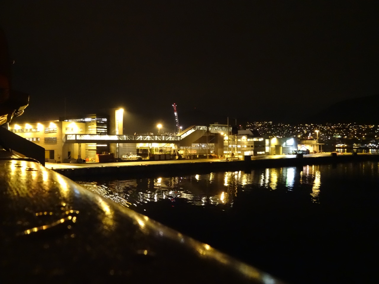 At 10:30, the last few people have arrived on the boat and we finally set sail. Although it is pitch black I do try my best to capture some photos of Bergen as we leave. Some of the decks are slippery. In fact, the main rear deck is entirely covered in an inch thick layer of ice. By 11pm I have had a long day, and decide to head to my cabin and bed.